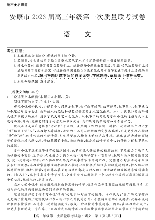 高三语文--陕西省安康市2023届高三上学期第一次质量联考(一模)