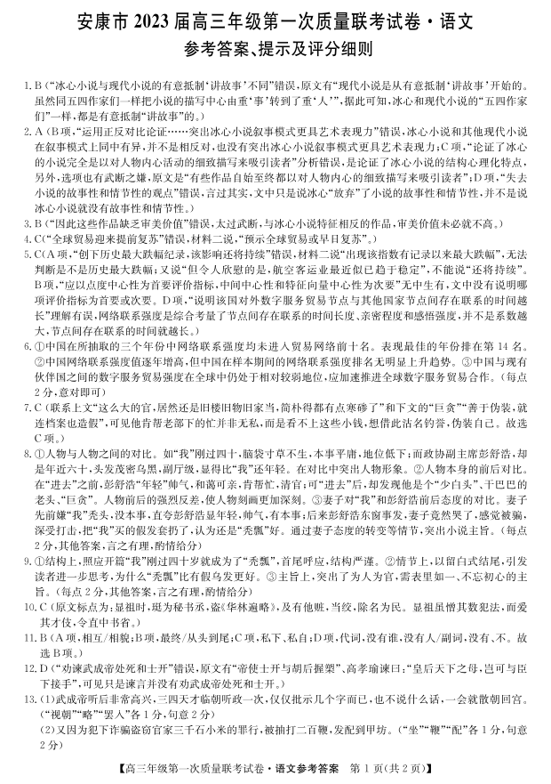 高三语文答案--陕西省安康市2023届高三上学期第一次质量联考(一模)