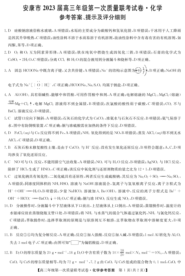 高三化学答案--陕西省安康市2023届高三上学期第一次质量联考(一模)