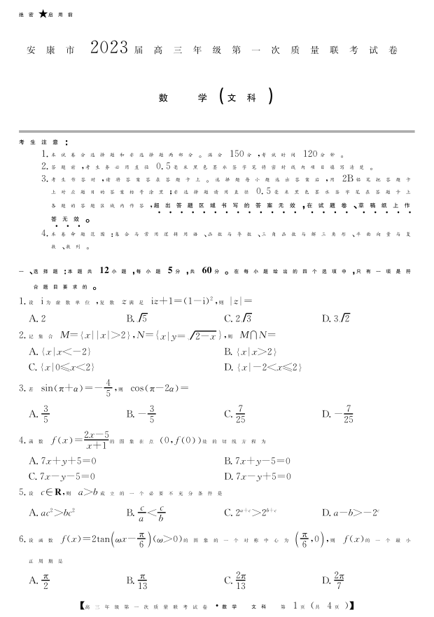 高三数学(文)--陕西省安康市2023届高三上学期第一次质量联考(一模)