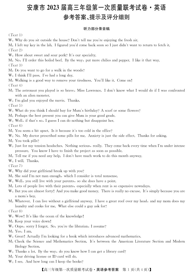 高三英语答案--陕西省安康市2023届高三上学期第一次质量联考(一模)