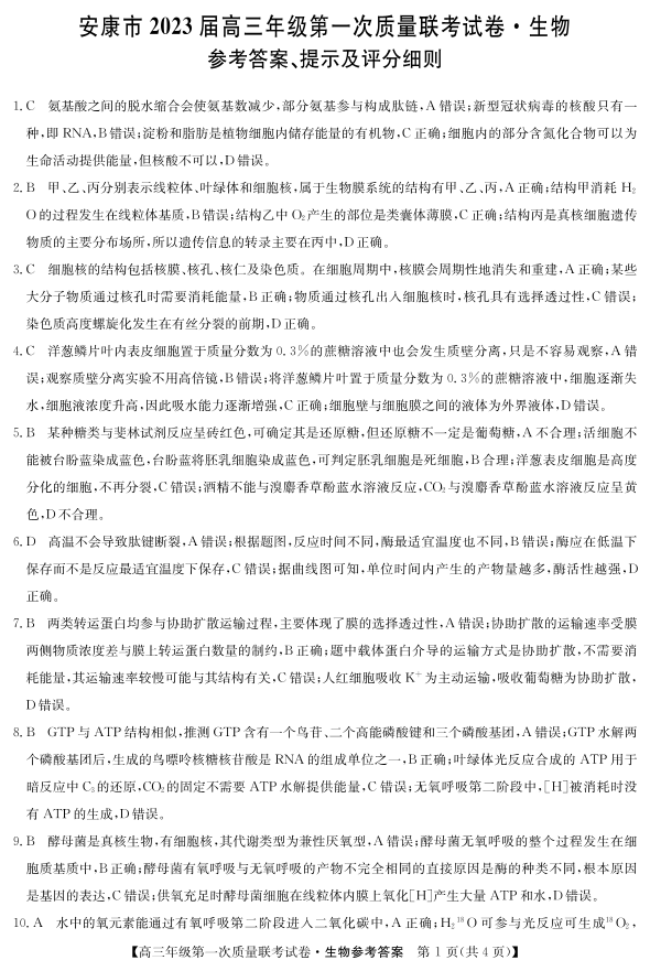 高三生物答案--陕西省安康市2023届高三上学期第一次质量联考(一模)