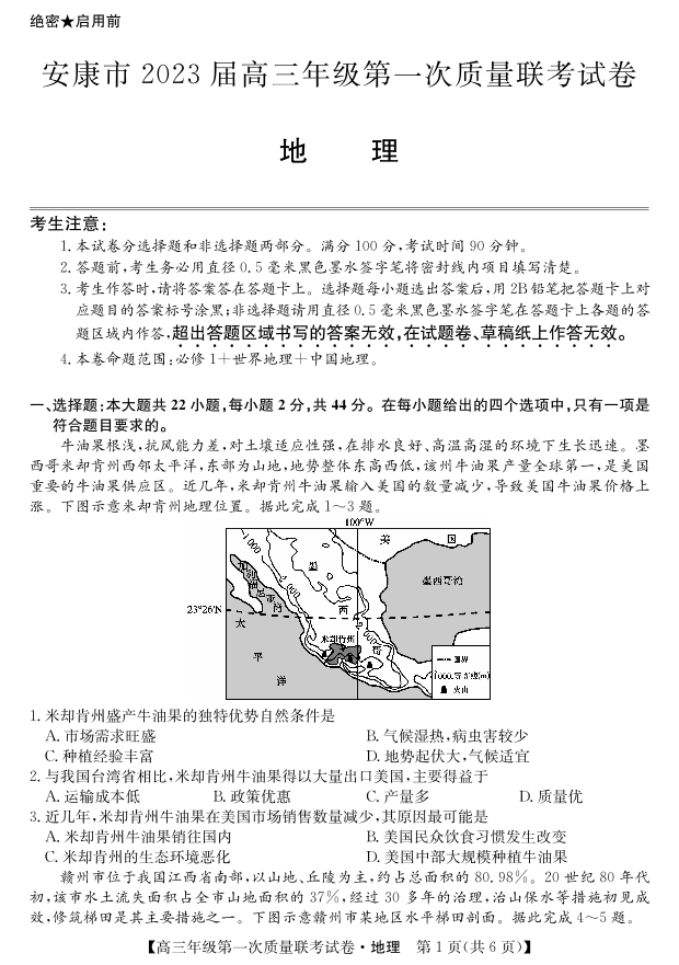 高三地理--陕西省安康市2023届高三上学期第一次质量联考(一模)