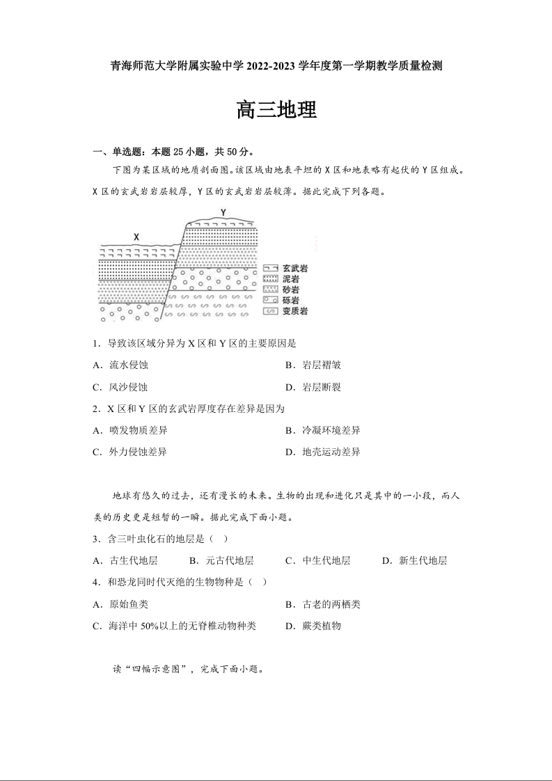 高三地理+答案--青海省西宁市青海师范大学附属实验中学2023高三上学期12月月考