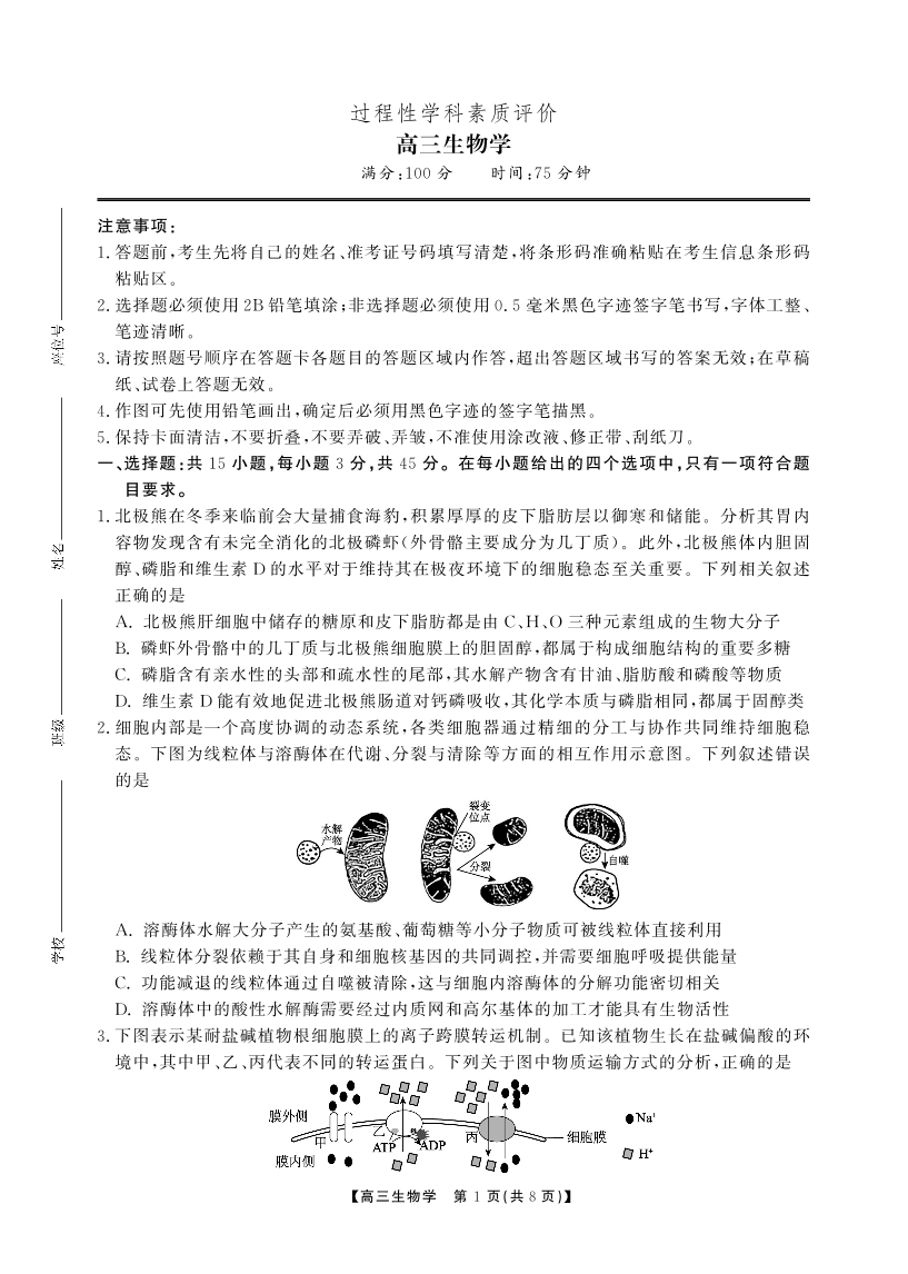 高三生物--安徽省鼎尖联考2026届高三上学期期末过程性学科素质评价