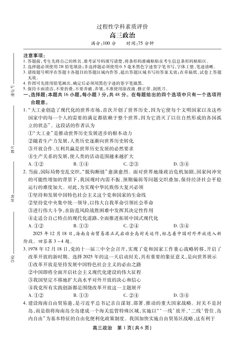 高三政治--安徽省鼎尖联考2026届高三上学期期末过程性学科素质评价