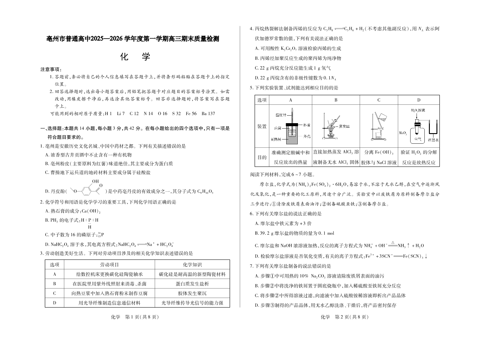 高三化学--安徽省毫州市普通高中2026届第一学期高三期末质量检测