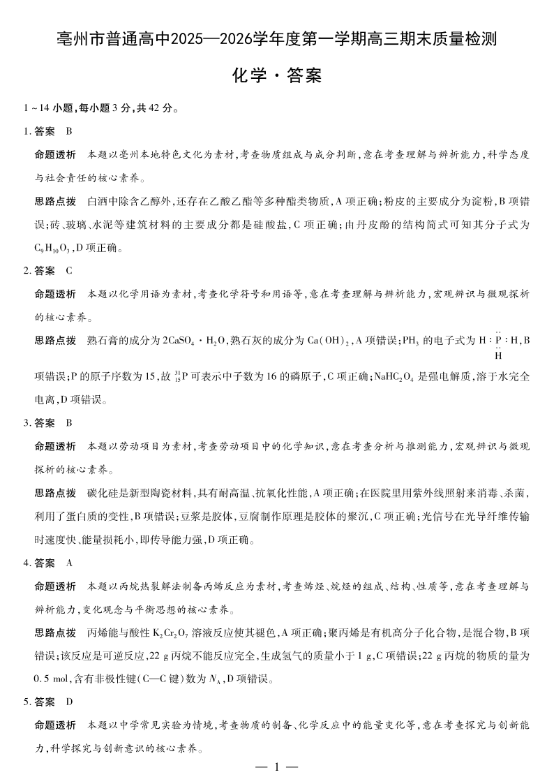 高三化学答案--安徽省毫州市普通高中2026届第一学期高三期末质量检测