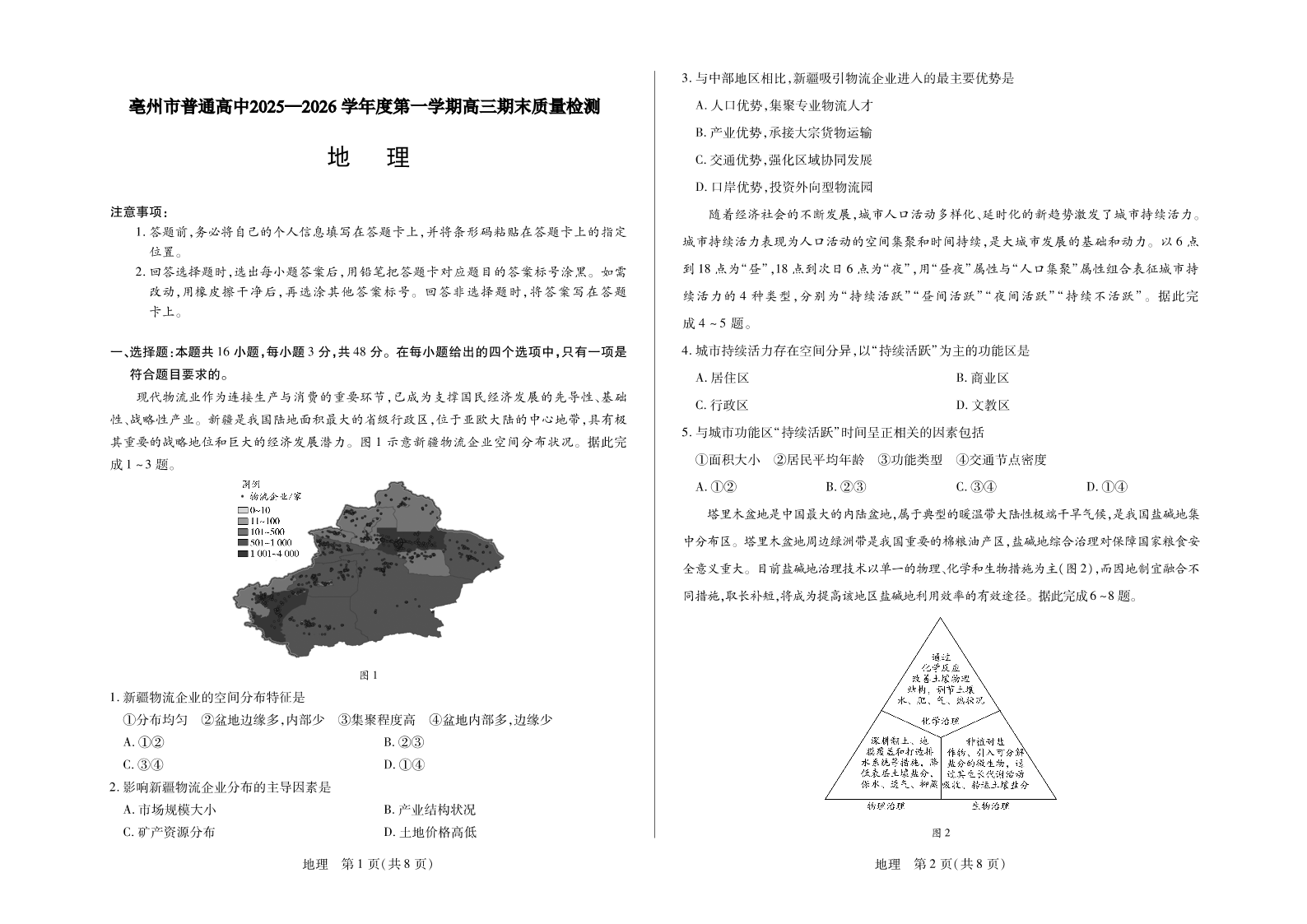 高三地理--安徽省毫州市普通高中2026届第一学期高三期末质量检测