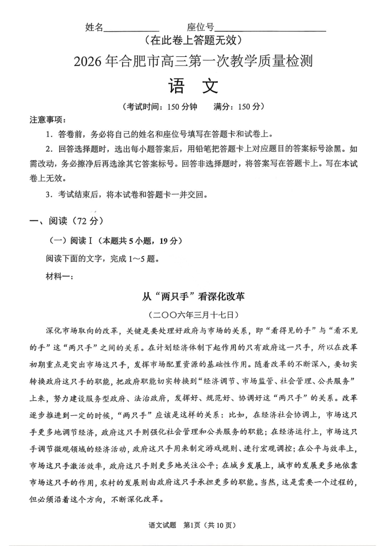 高三语文+答案--安徽省合肥市2026届高三上学期第一次教学质量检测