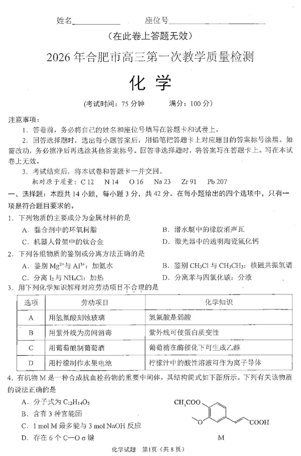 高三化学--安徽省合肥市2026届高三上学期第一次教学质量检测