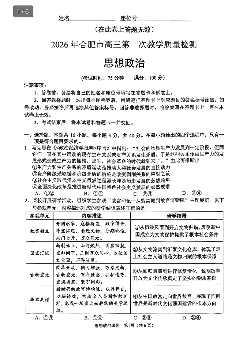 高三政治+答案--安徽省合肥市2026届高三上学期第一次教学质量检测