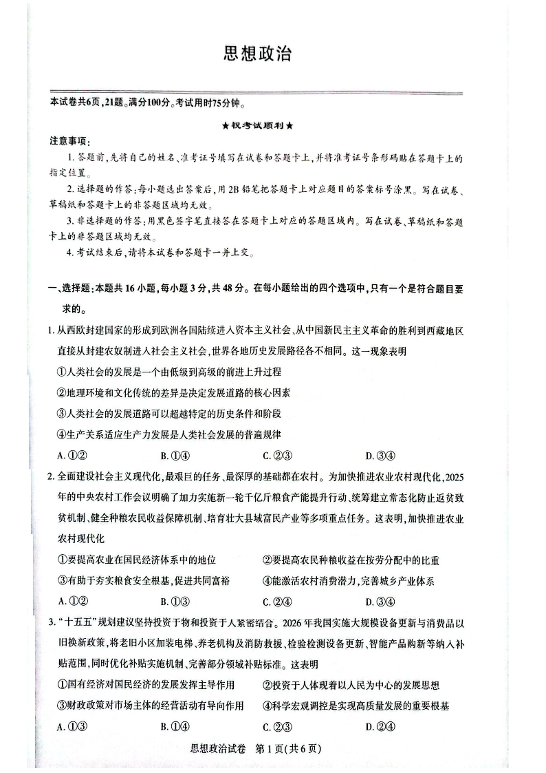 高三政治--湖北省2026届高三圆创联盟2月联考