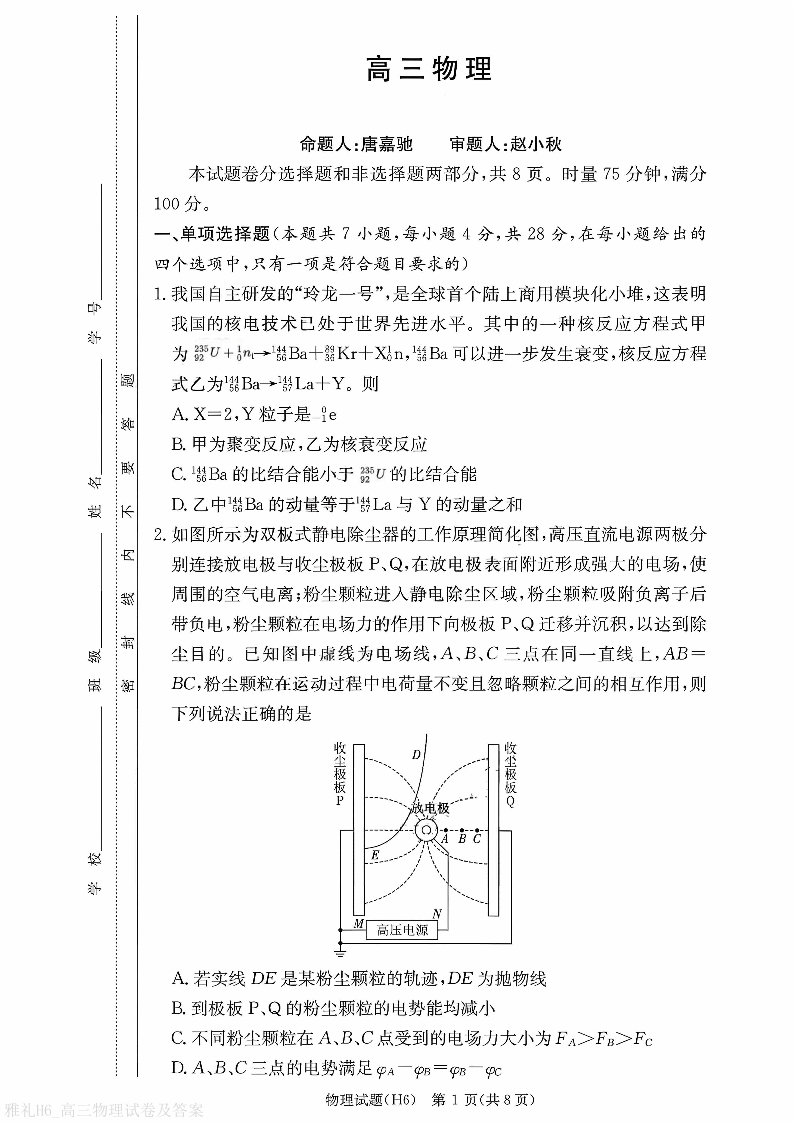 高三物理+答案--湖南雅礼中学2026届高三上学期2月期末