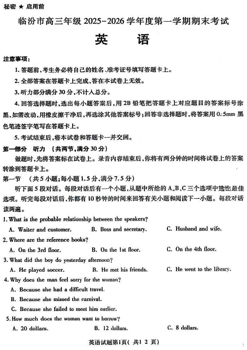 高三英语--山西省临汾市高三年级2026届度第一学期期末考试