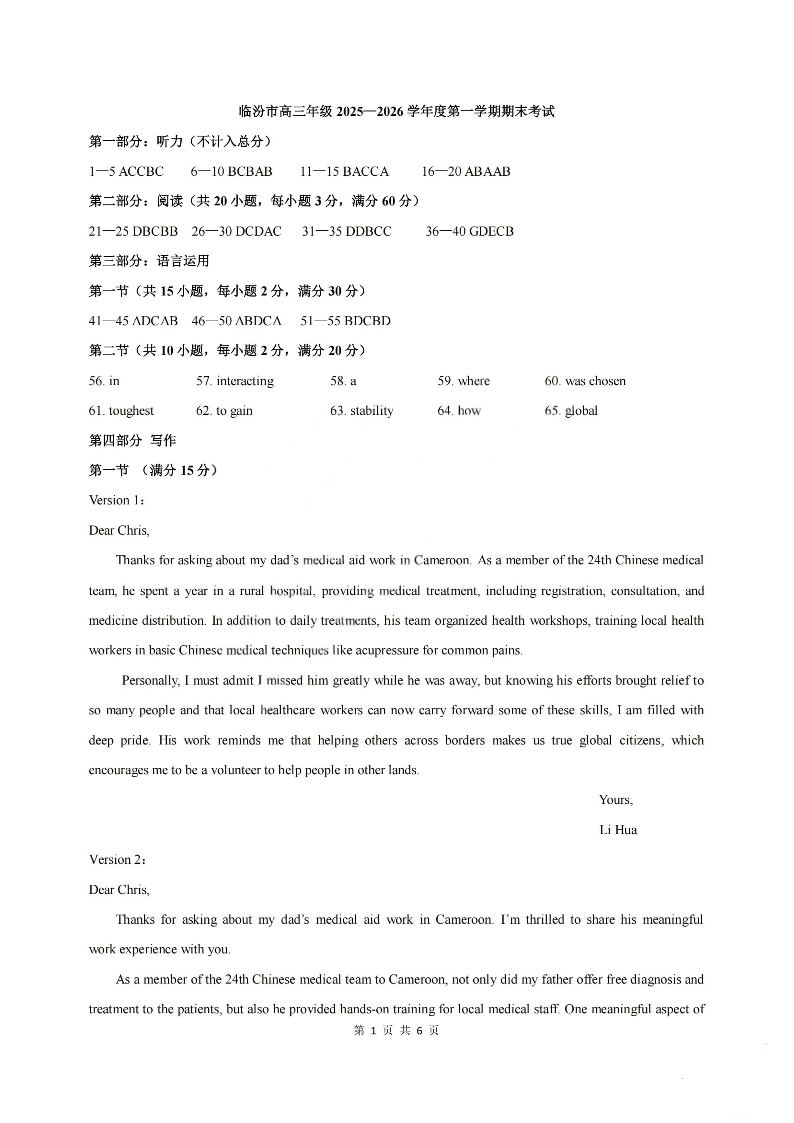 高三英语答案--山西省临汾市高三年级2026届度第一学期期末考试