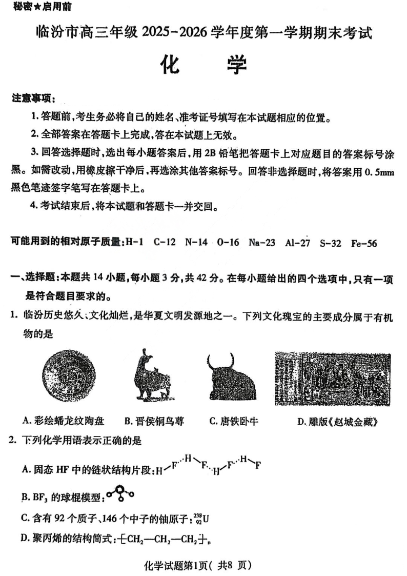 高三化学--山西省临汾市高三年级2026届度第一学期期末考试