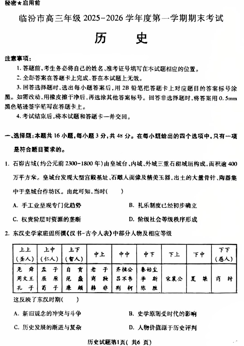 高三历史--山西省临汾市高三年级2026届度第一学期期末考试