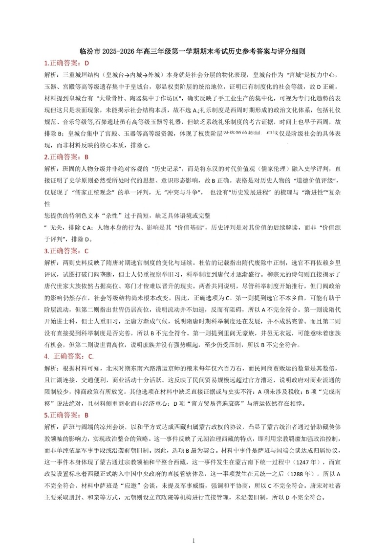高三历史答案--山西省临汾市高三年级2026届度第一学期期末考试