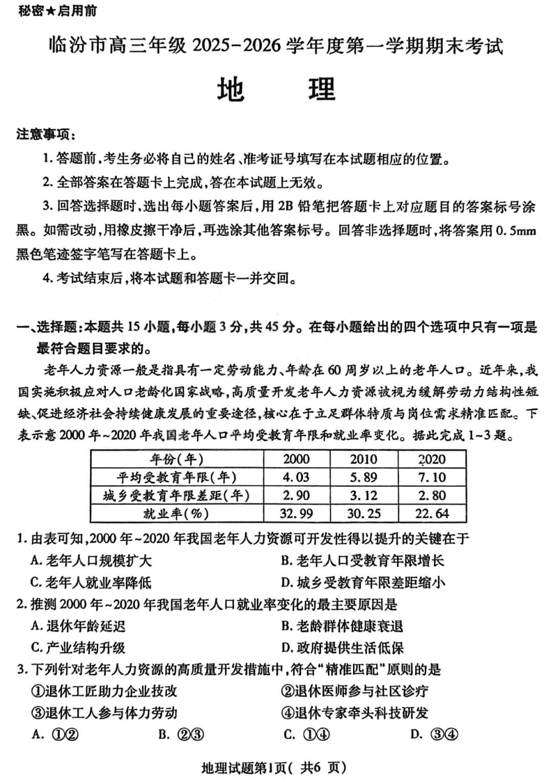 高三地理--山西省临汾市高三年级2026届度第一学期期末考试