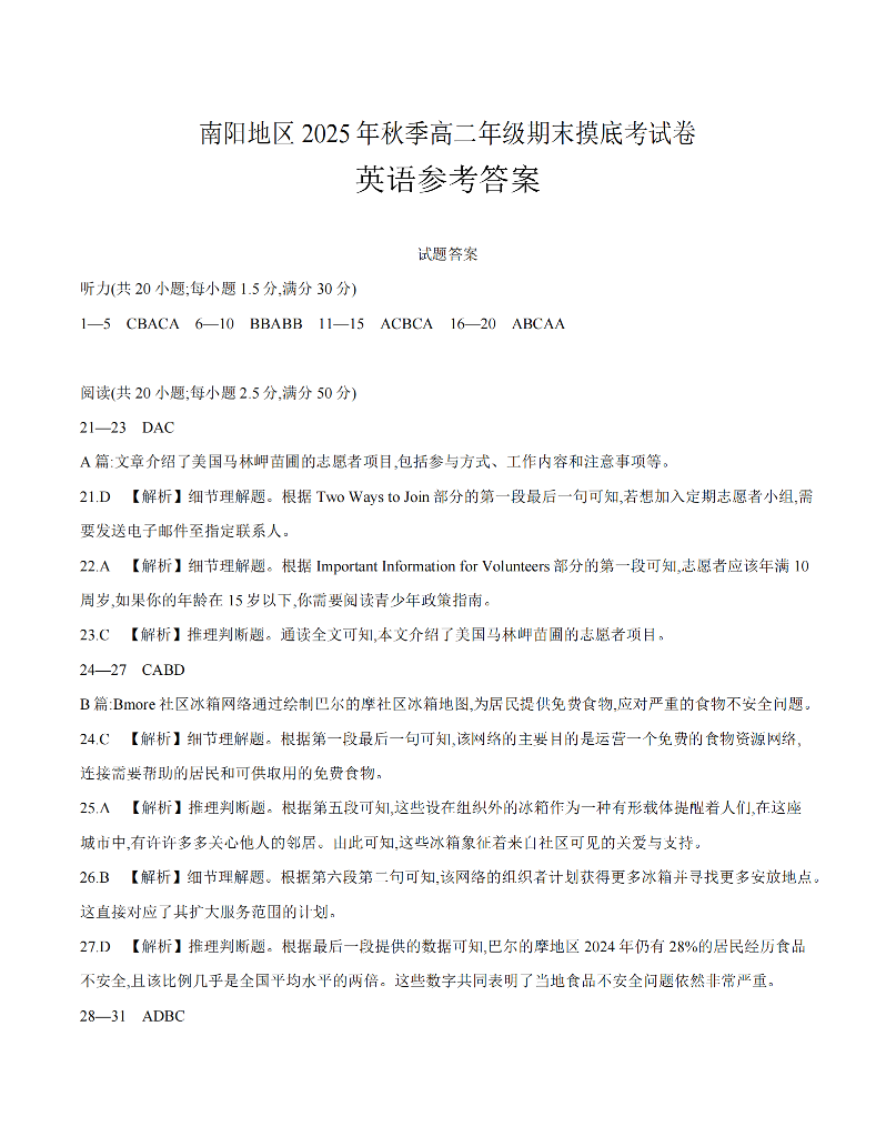 高二英语答案--河南省南阳地区2025-2026学年高二上学期期末摸底考试