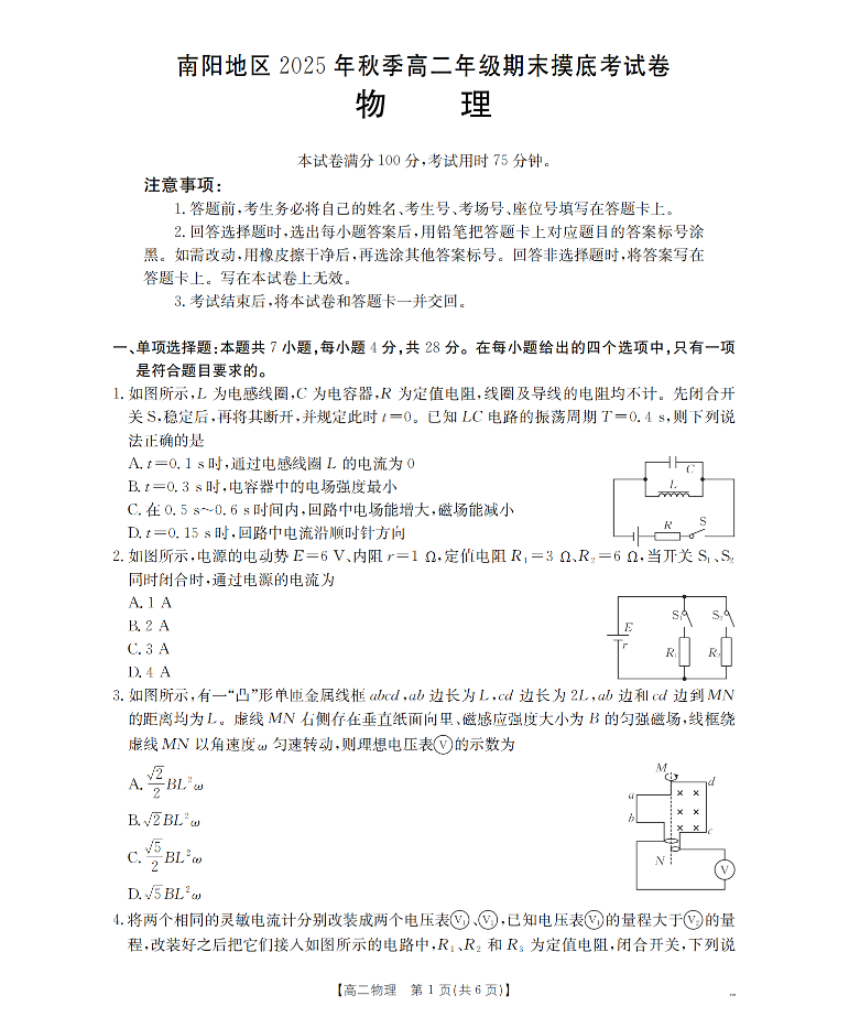 高二物理--河南省南阳地区2025-2026学年高二上学期期末摸底考试