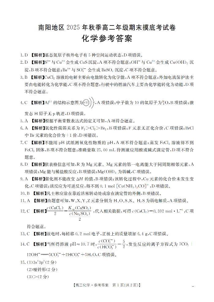 高二化学答案--河南省南阳地区2025-2026学年高二上学期期末摸底考试