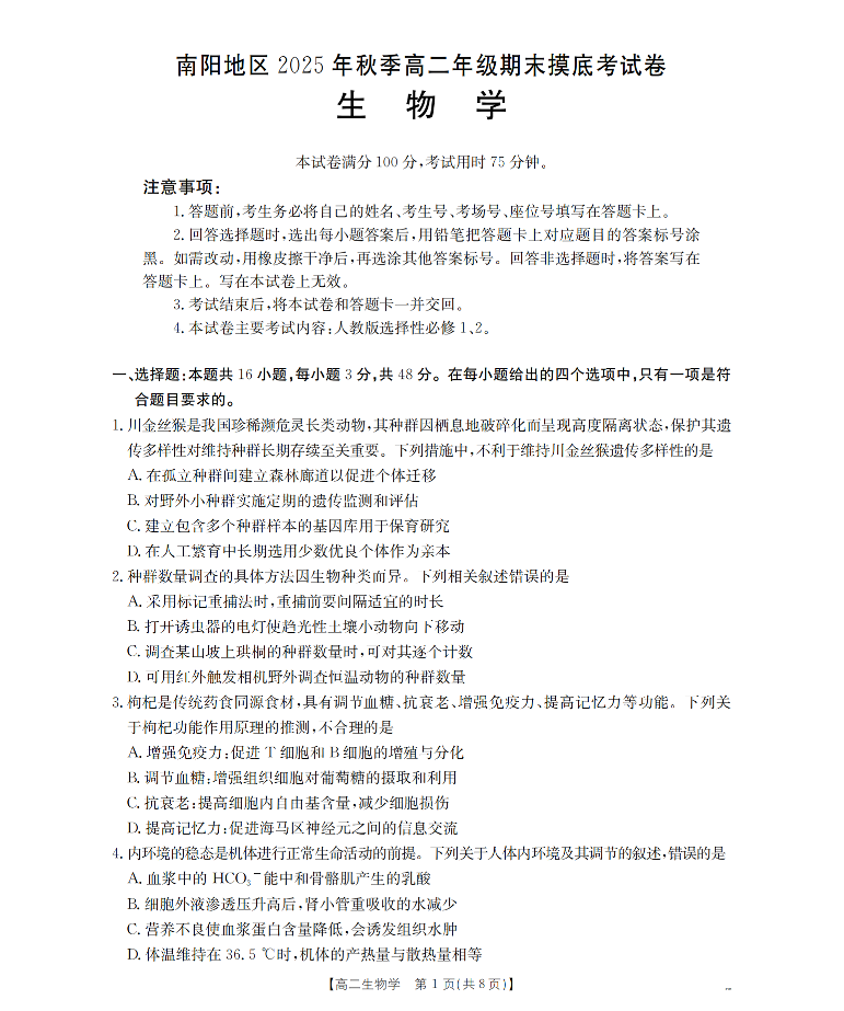 高二生物--河南省南阳地区2025-2026学年高二上学期期末摸底考试