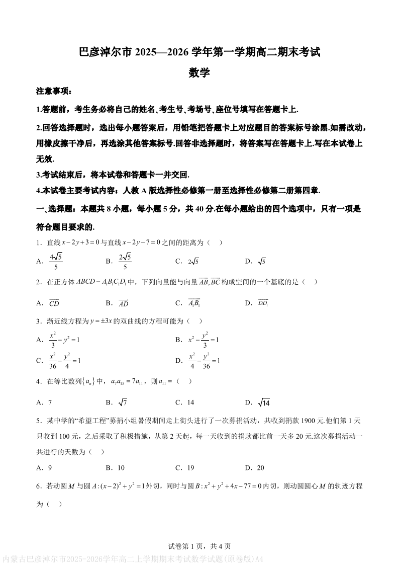 高二数学--内蒙古巴彦淖尔市2025-2026学年高二上学期期末考试