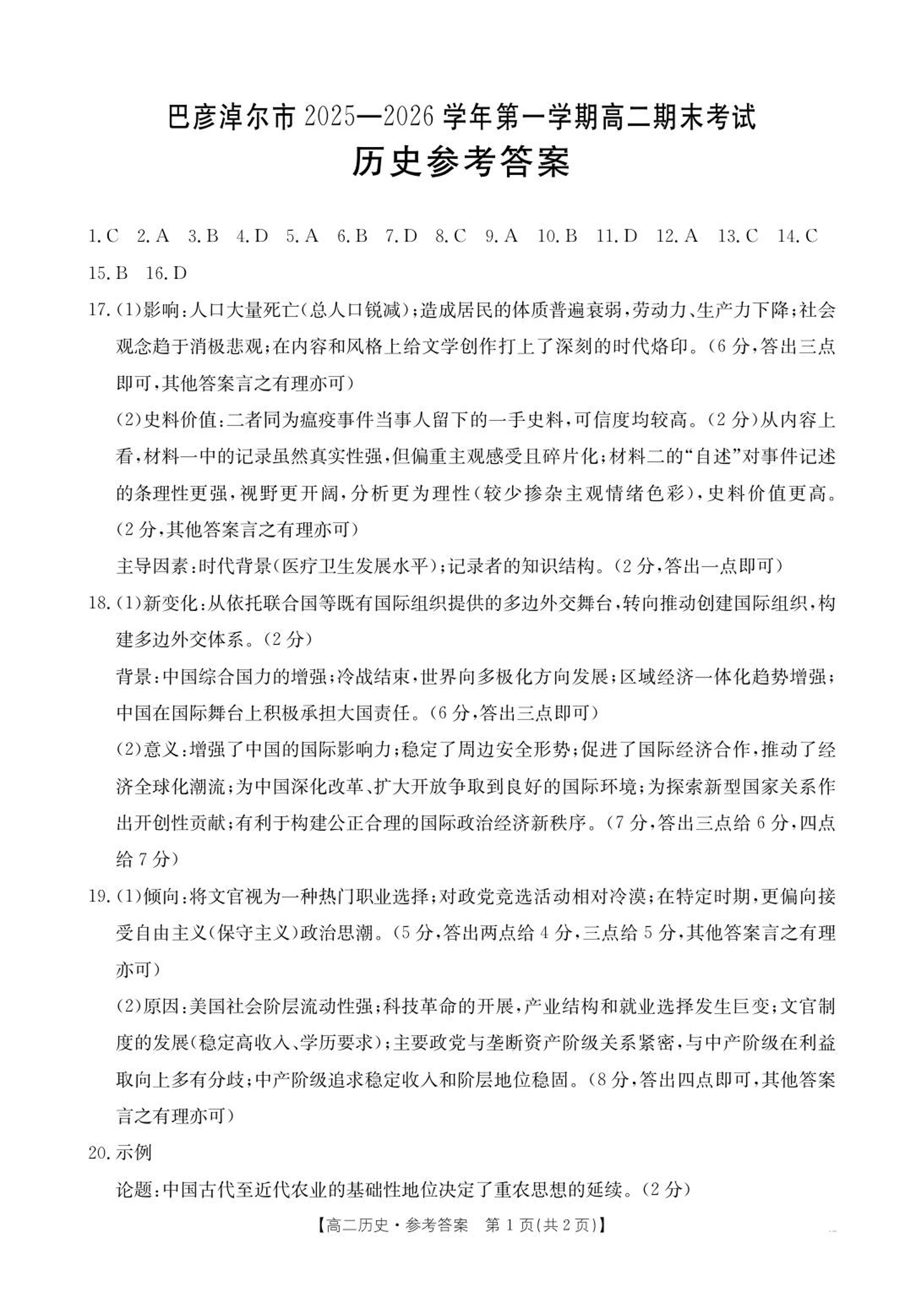 高二历史答案--内蒙古巴彦淖尔市2025-2026学年高二上学期期末考试