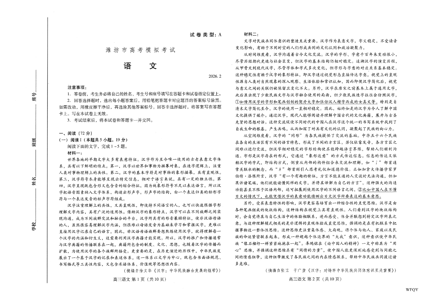 高三语文--山东省潍坊市2026.2高三模拟
