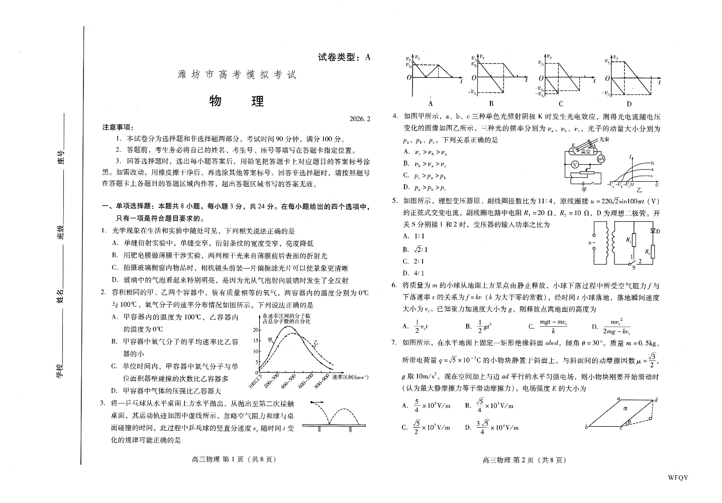 高三物理--山东省潍坊市2026.2高三模拟