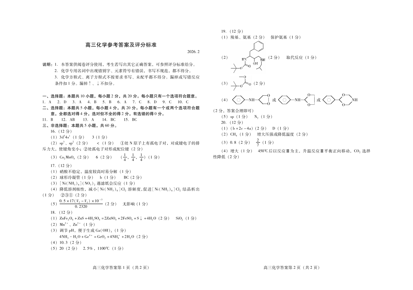 高三化学答案--山东省潍坊市2026.2高三模拟