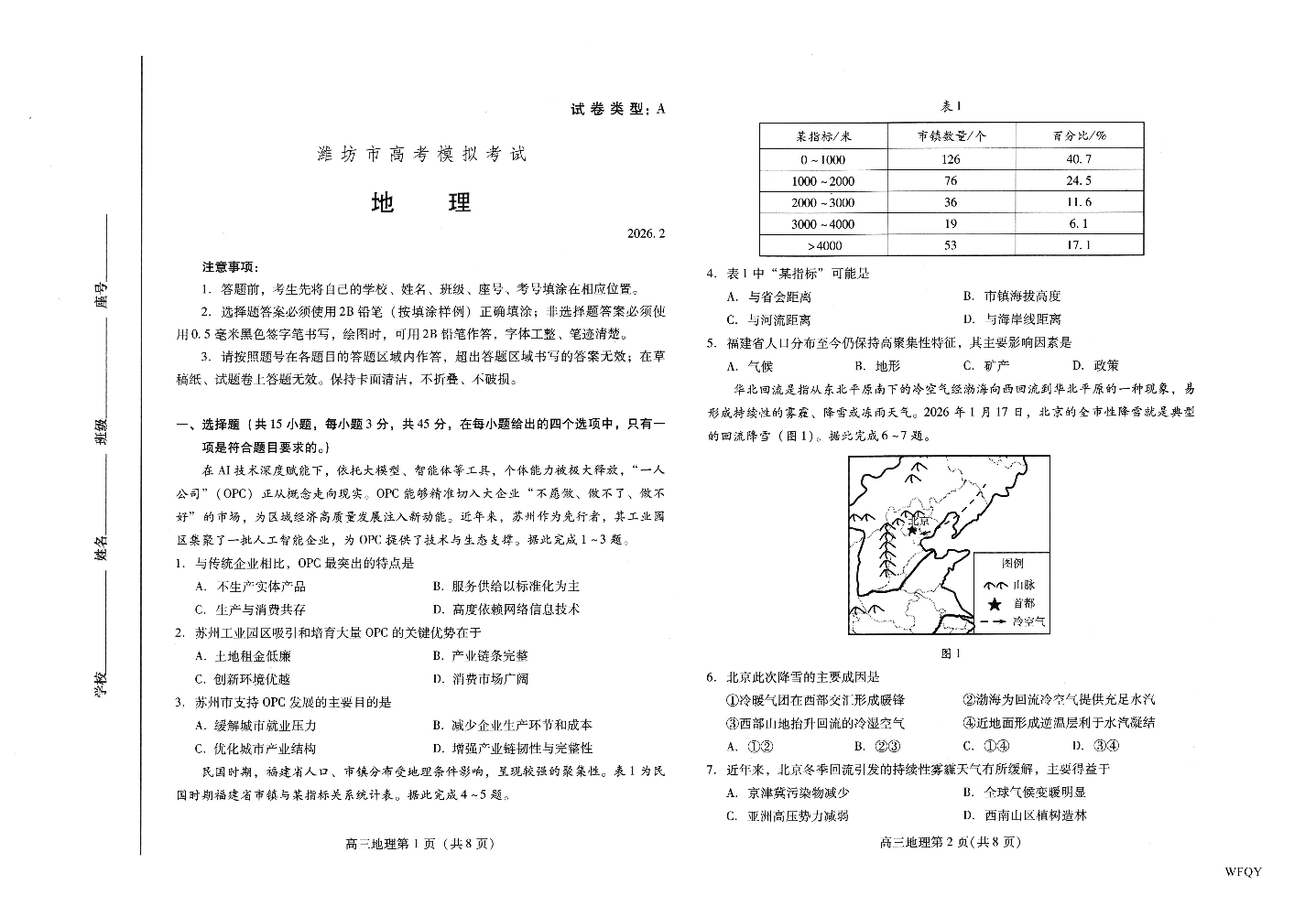 高三地理--山东省潍坊市2026.2高三模拟