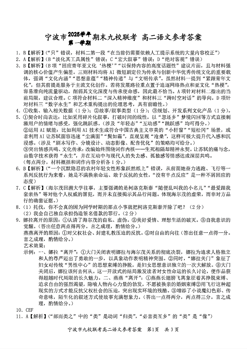 高二语文答案--浙江省宁波市九校2025-2026学年高二上学期期末联考