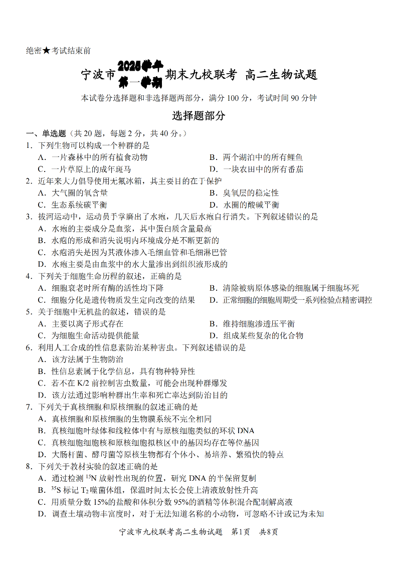 高二生物--浙江省宁波市九校2025-2026学年高二上学期期末联考