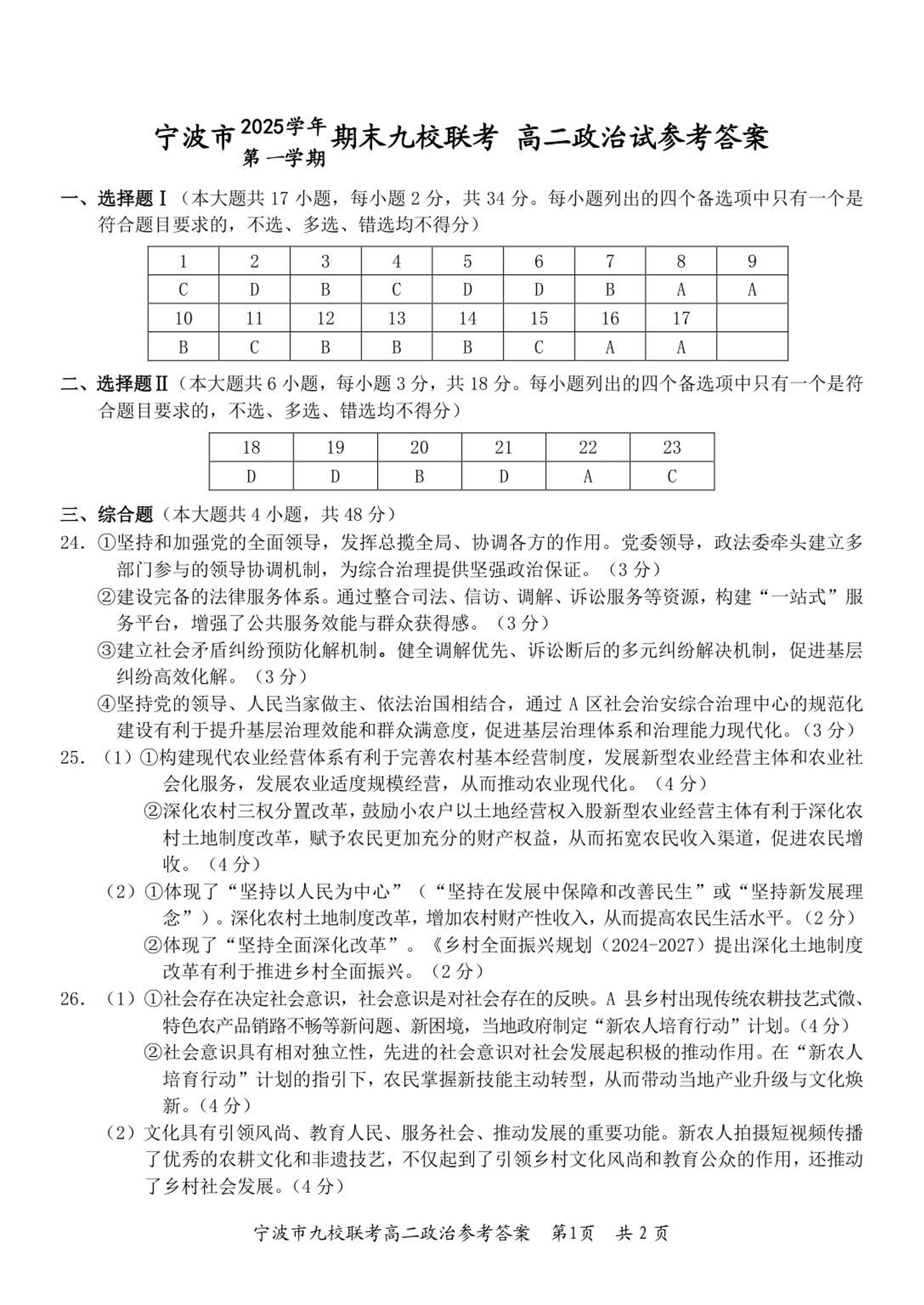 高二政治答案--浙江省宁波市九校2025-2026学年高二上学期期末联考