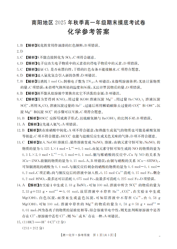 高一化学答案--河南省南阳地区2025-2026学年高一上学期期末摸底考试