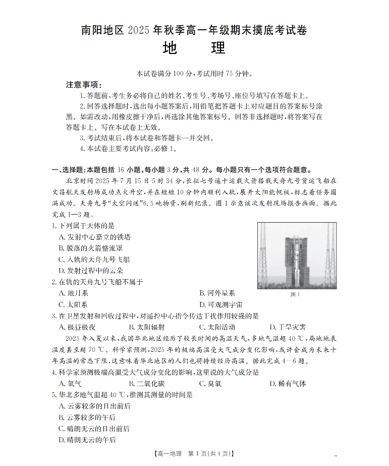 高一地理--河南省南阳地区2025-2026学年高一上学期期末摸底考试