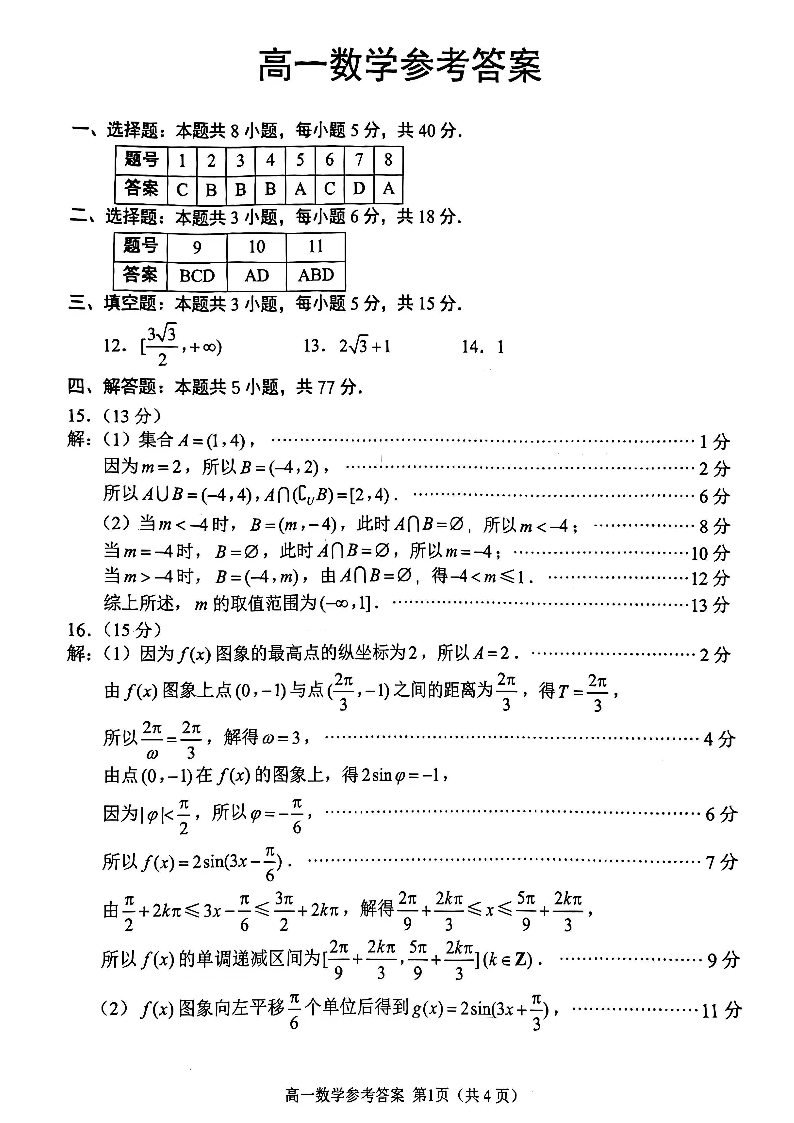 高一数学答案--江苏省苏州市2025-2026学年度高一上学期期末考试