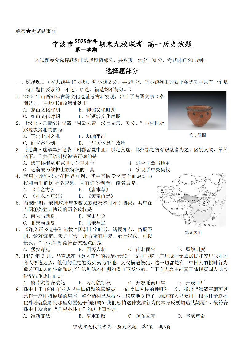 高一历史--浙江省宁波市九校2025-2026学年高一上学期期末联考