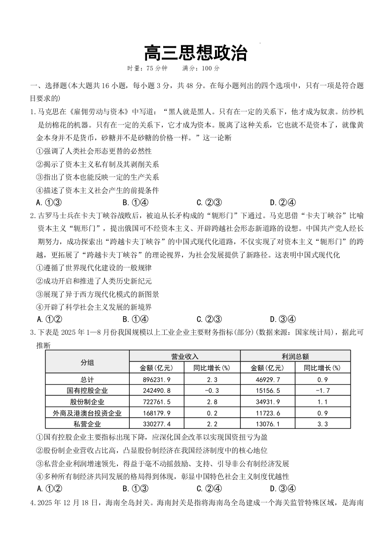 高三政治+答案--湖南省长沙市第一中学2026届高三上学期2月期末
