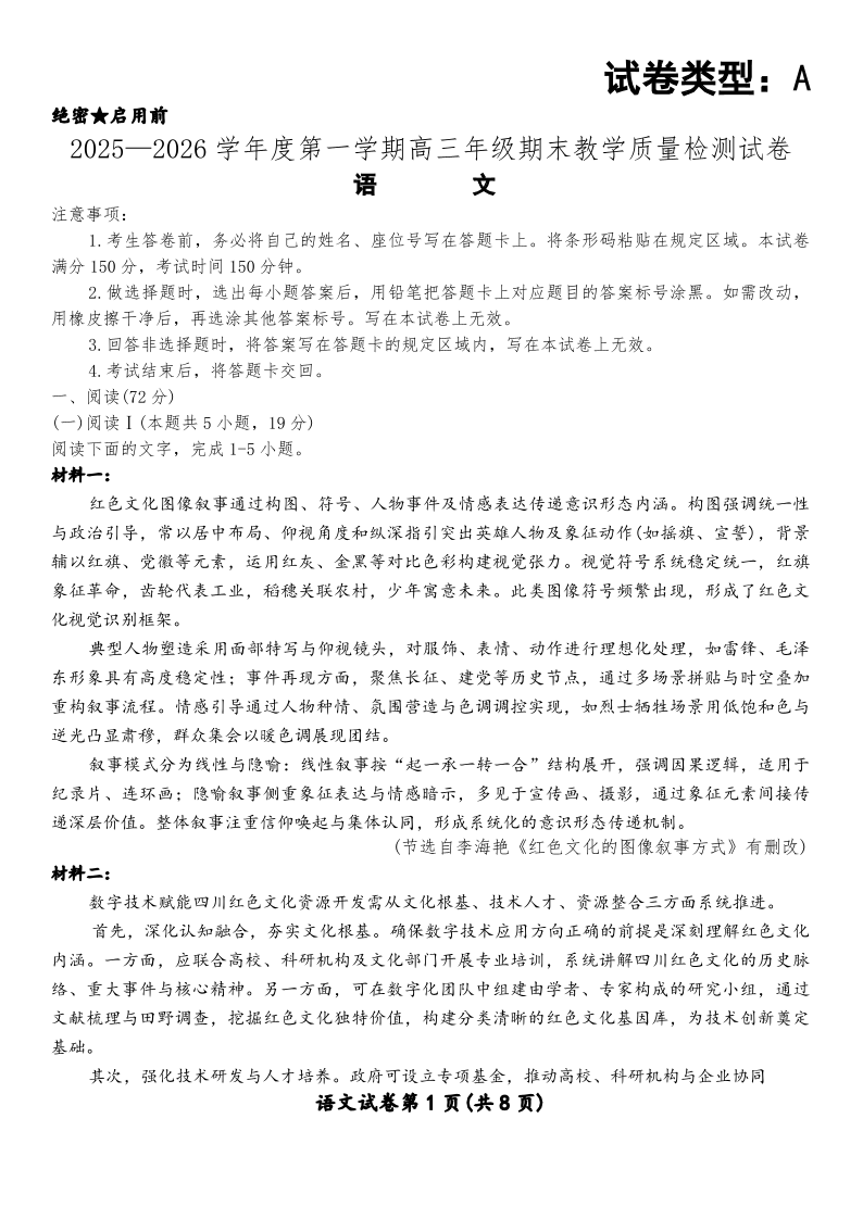 高三语文--内蒙古包头市2026届高三上学期期末教学质量检测试卷