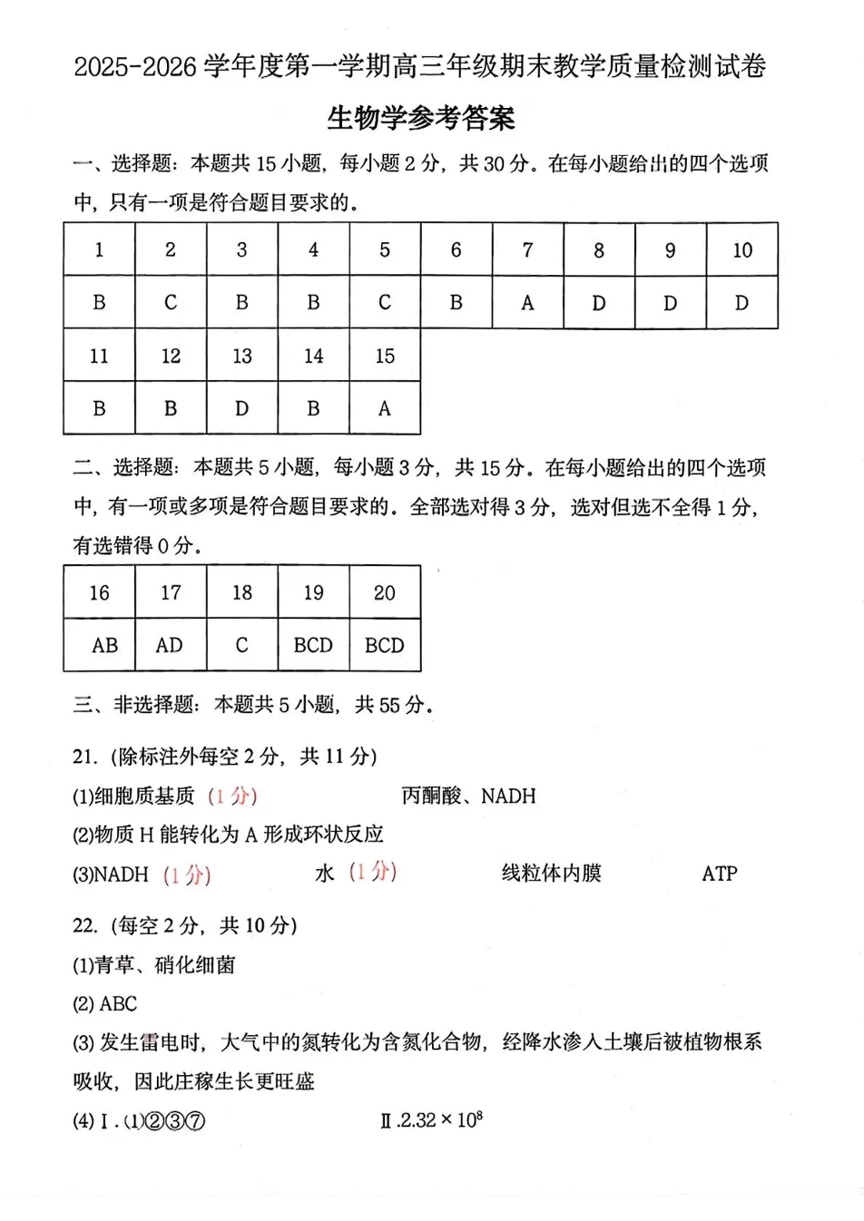 高三生物答案--内蒙古包头市2026届高三上学期期末教学质量检测试卷