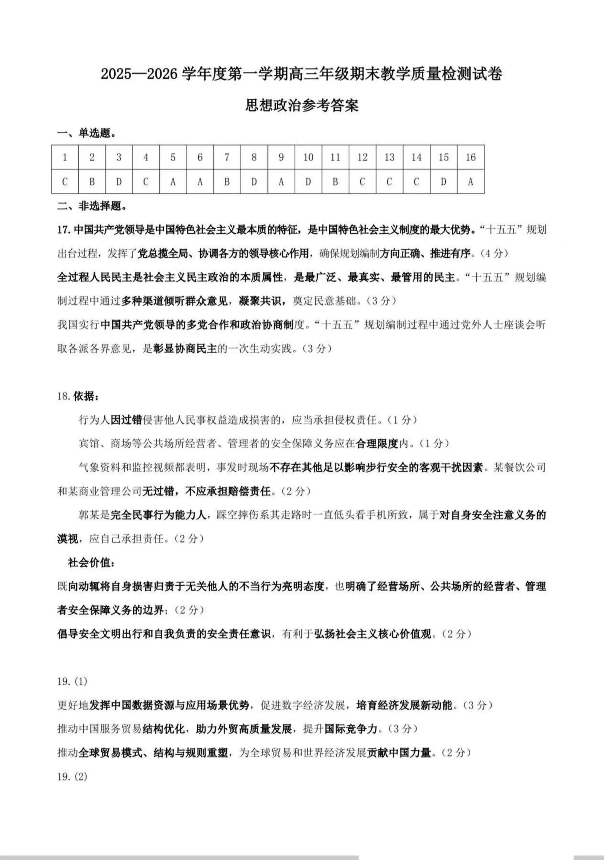 高三政治答案--内蒙古包头市2026届高三上学期期末教学质量检测试卷