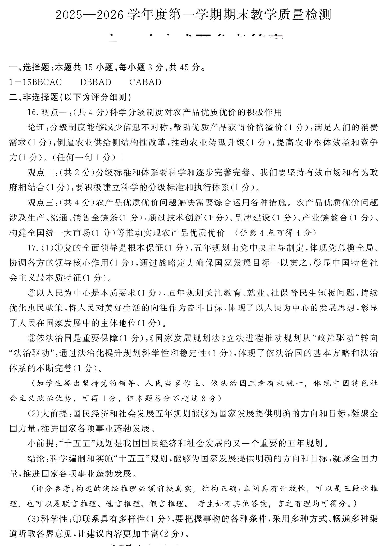 高三政治答案--山东省聊城市2026届高三上学期期末教学质量检测