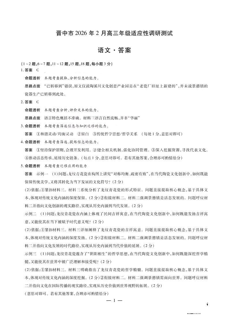 高三语文答案--山西省晋中市2026届高三年级2月适应性调研考试(晋中一模)