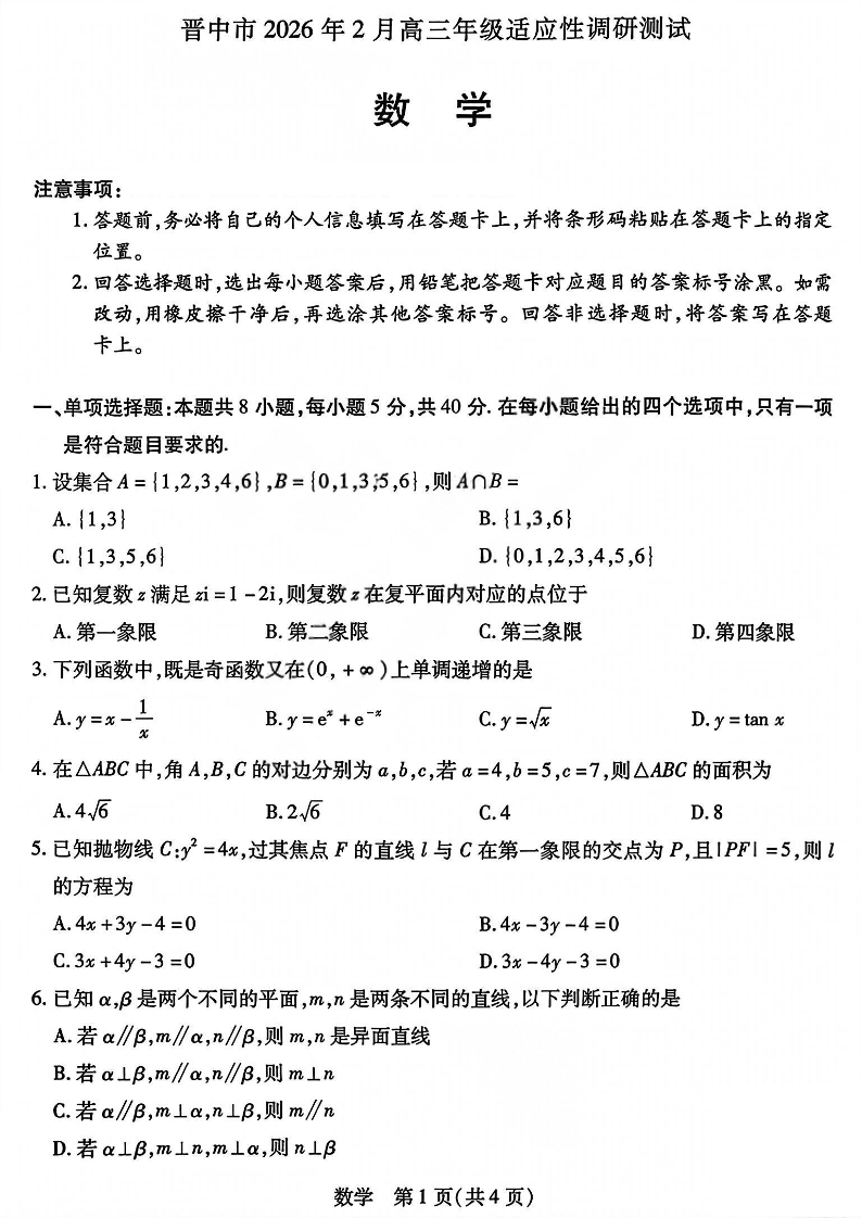 高三数学--山西省晋中市2026届高三年级2月适应性调研考试(晋中一模)
