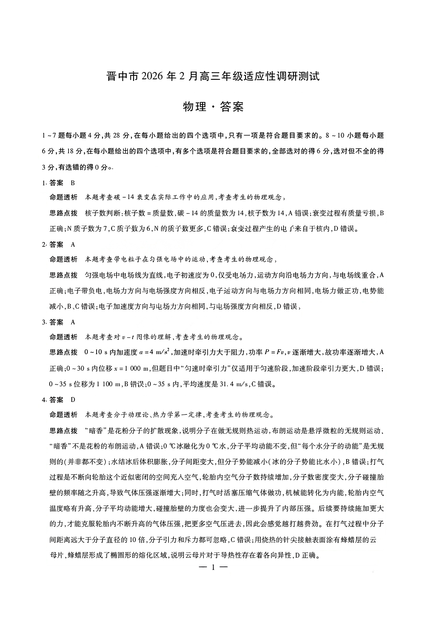高三物理答案--山西省晋中市2026届高三年级2月适应性调研考试(晋中一模)