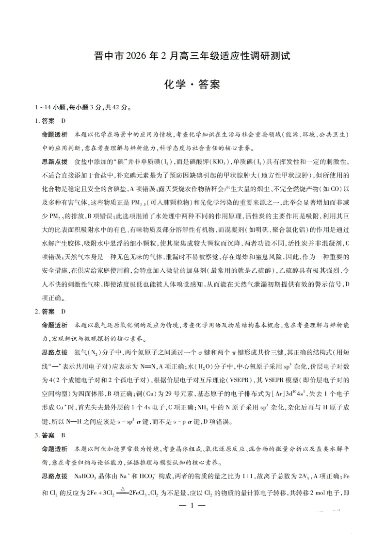 高三化学答案--山西省晋中市2026届高三年级2月适应性调研考试(晋中一模)